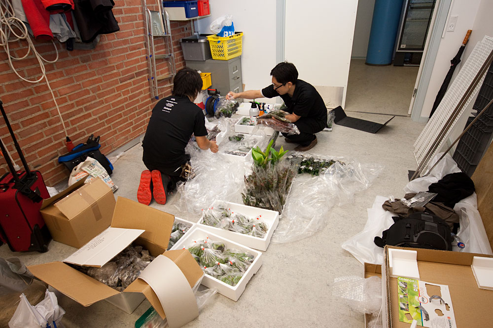 Wir sind bereits am Freitag angereist und haben für das Equipment gesorgt, welches dann vorbereitet und aufgebaut wurde. Neben dem Becken, dem Unterschrank und der gesamten Technik wurde die Veranstaltung von uns auch mit Steinen, Holz, Bodengrund und Promotionmaterial (Kataloge, Aqua Journal, Flyer etc.) versorgt, die ADA vorab direkt zu uns gesendet hatte. Die Pflanzen kamen zum kleineren Teil direkt aus Singapur, der größere Teil wurde von Herrn Amano in den Pflanzengärtnereinen der Firma Tropica ausgesucht.