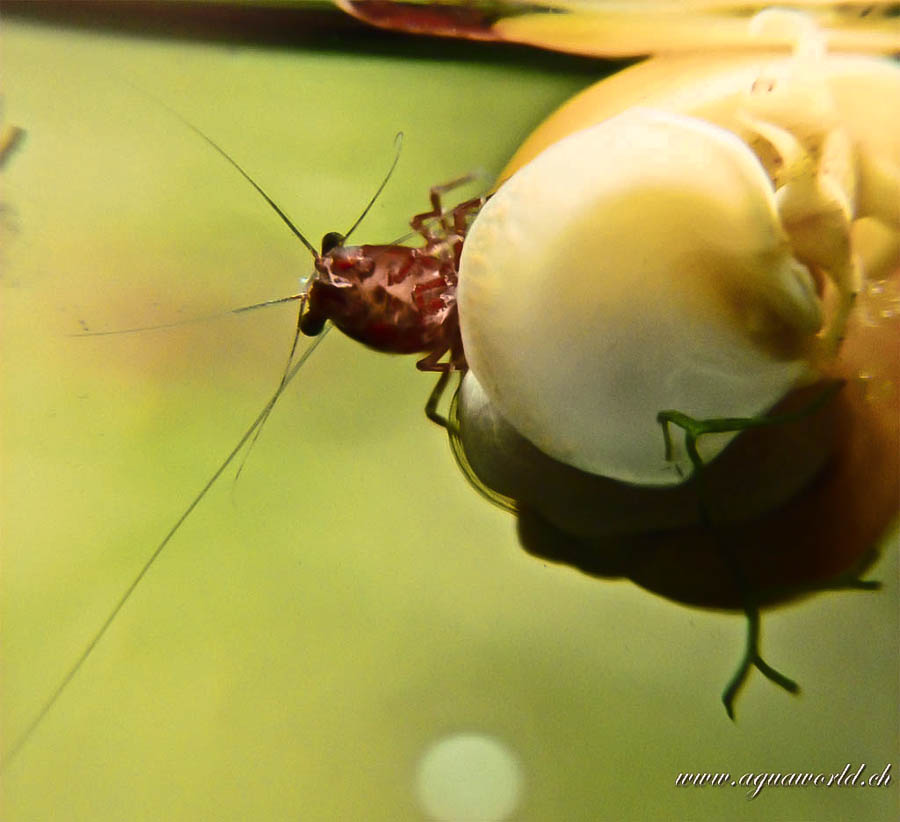 Die Garnelen lieben es die Gehäuse der Schnecken abzuweiden.