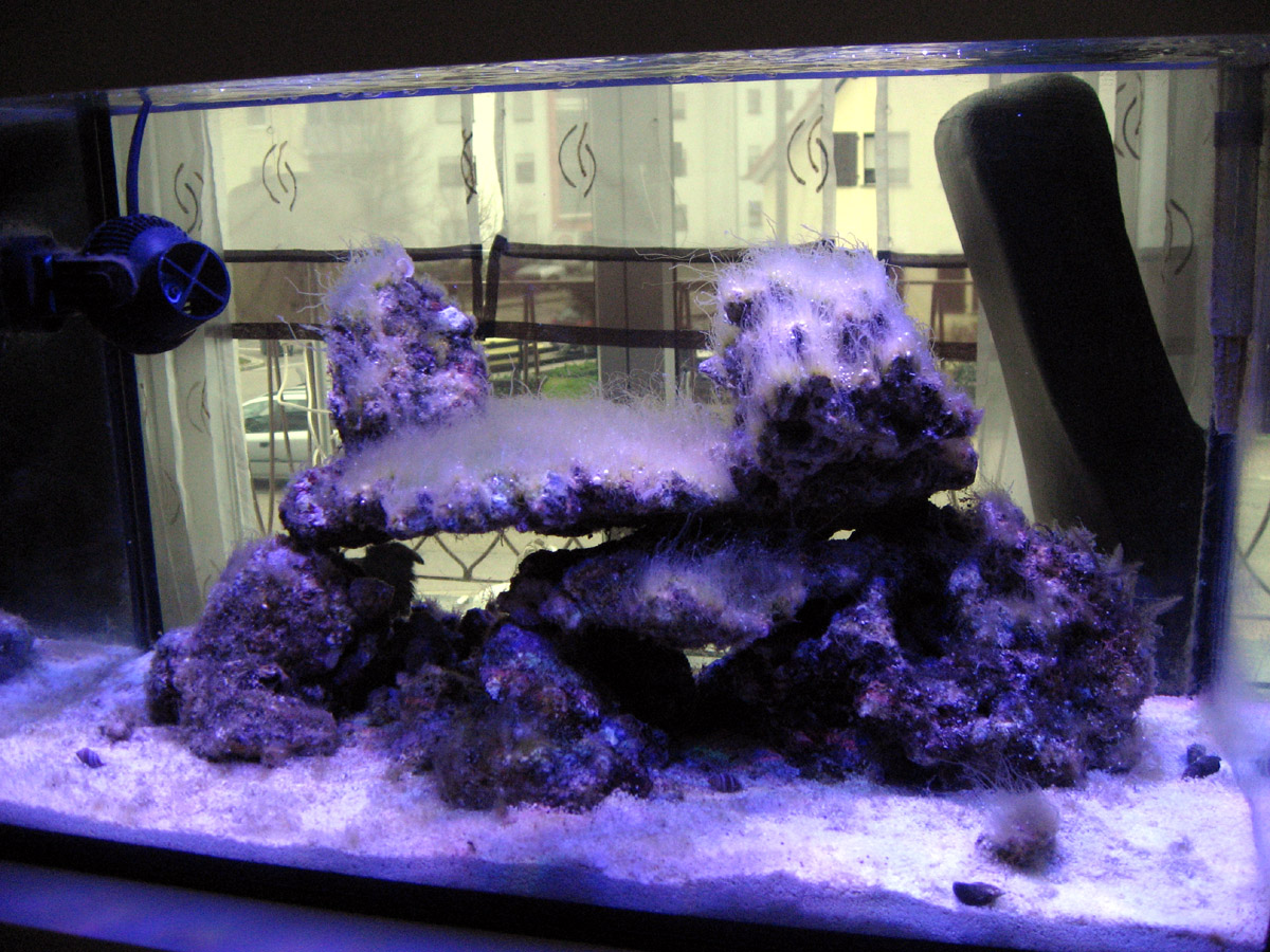 Die dunkelroten Kalkalgen sind am wachsen,der Abschäumer schafft den gelößten(und feine "Teilchen") aus dem System,damit ist der Grundstein für ein "Riff" schon mal gesetzt.