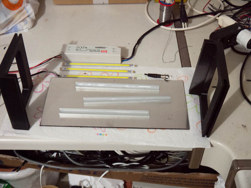 Also so schwierig ist das nicht. Gelötet habe ich ca. 8 mal. Und der Rest ist mehr zusammenschrauben. Leider habe ich kein Foto der erweiterten Leuchte aber ich habe wegen Wärmeproblemen oben drauf noch zwei Kühler montiert. Die Leuchte mach gut 2500 Lumen. Das reicht für 54 Liter.