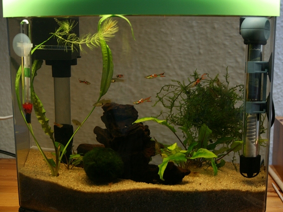 Darin war die Pumpe integriert. Ich hab dann eine kleine Heizung, ein Termometer, Bodengrund, Licht und Deko dazugekauft.