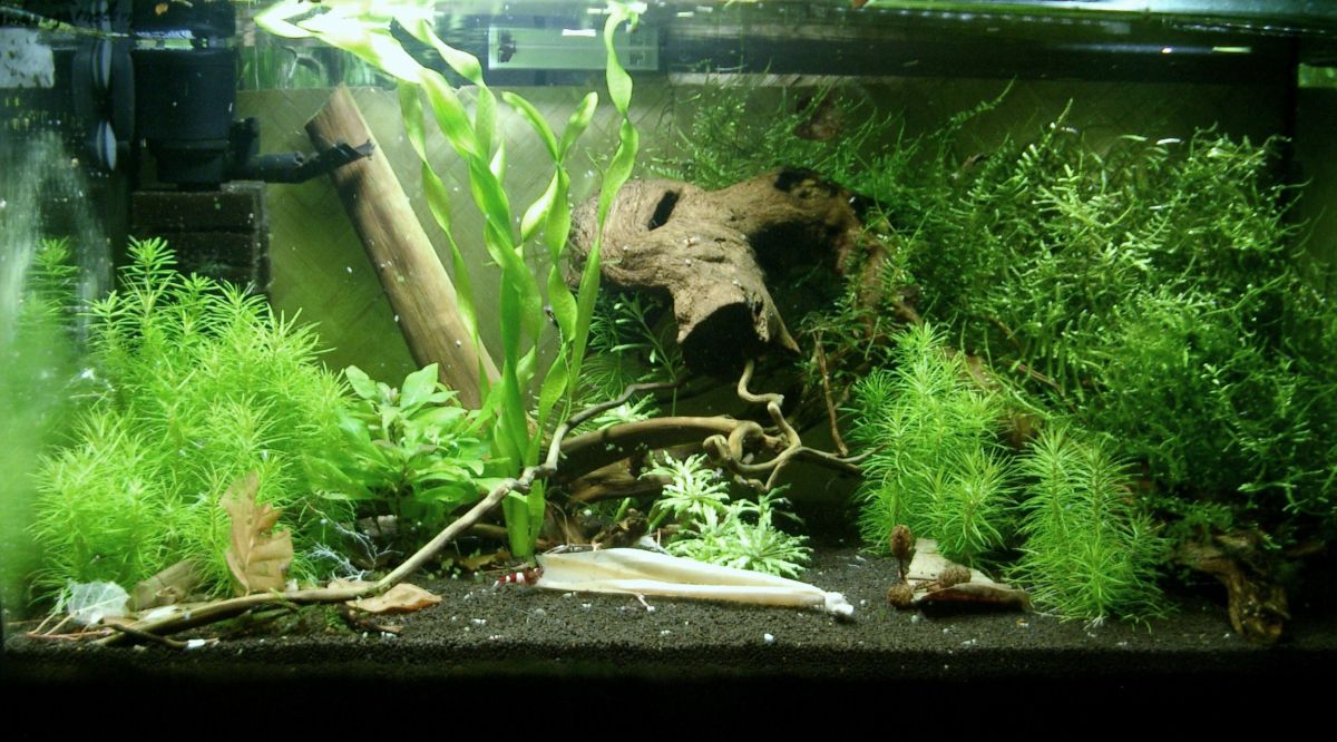 Beckenmaße sind 60x30x30cm. Bodengrund besteht aus 9L ADA-Amazonia-Powder. Die Filterung erfolgt mittels Aquael 500 Schwammfilter. Dieser wird abhängig vom Verschmutzungsgrad gedrosselt. Gereinigt wird dieser erst, wenn ich auf volle Leistung stellen muss. Beleuchtet wird mit einer Aquatic Duo Boy 26 Watt und einer Aquael LED 5 Watt.