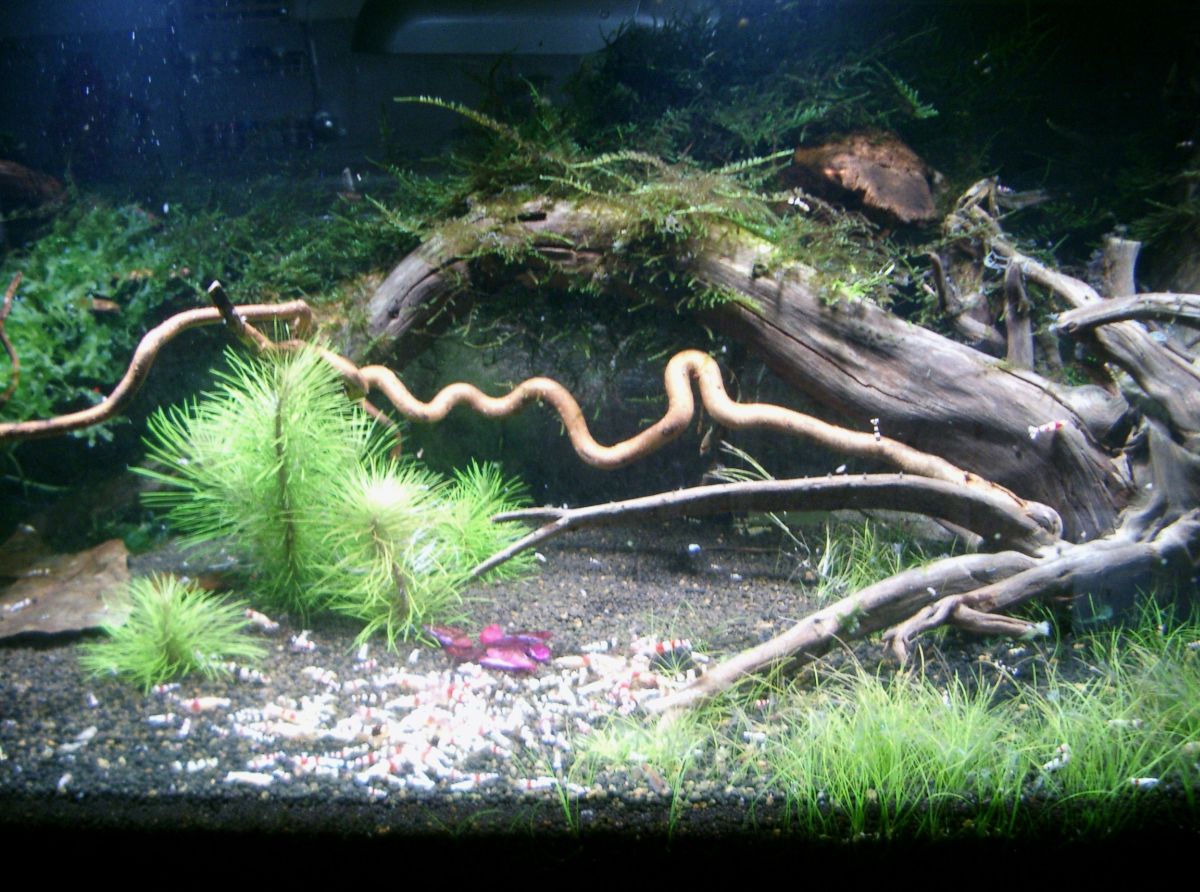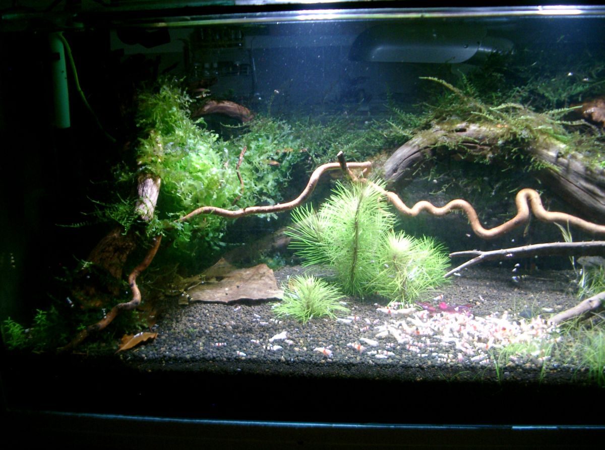 Einige Pflanzen sind hinzugekommen. Unter anderem auch Alternanthera reineckii 'rosaefolia', welche die Garnelen leider als willkommene Abwechslung ihres Speiseplans ansehen X(