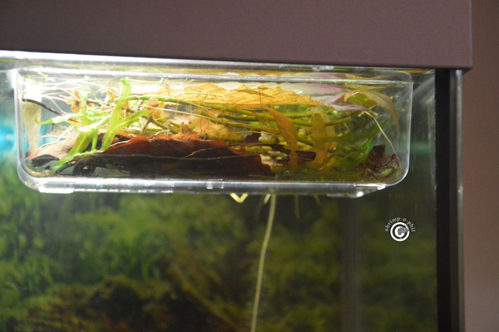 Jedenfalls ist es wirklich äußerst praktisch. Gefüllt habe ich sie mit Laub (jetzt weiß ich wenigstens auch, dass Buche ihre Lieblingssorte zu sein scheint), Monosolenium, Ricciafizzeln und was sonst noch so lose rumgetrieben ist. Mindestens 1 mal am Tag tausche ich das Wasser und hoffe das meine Wassernanny das auch tut.