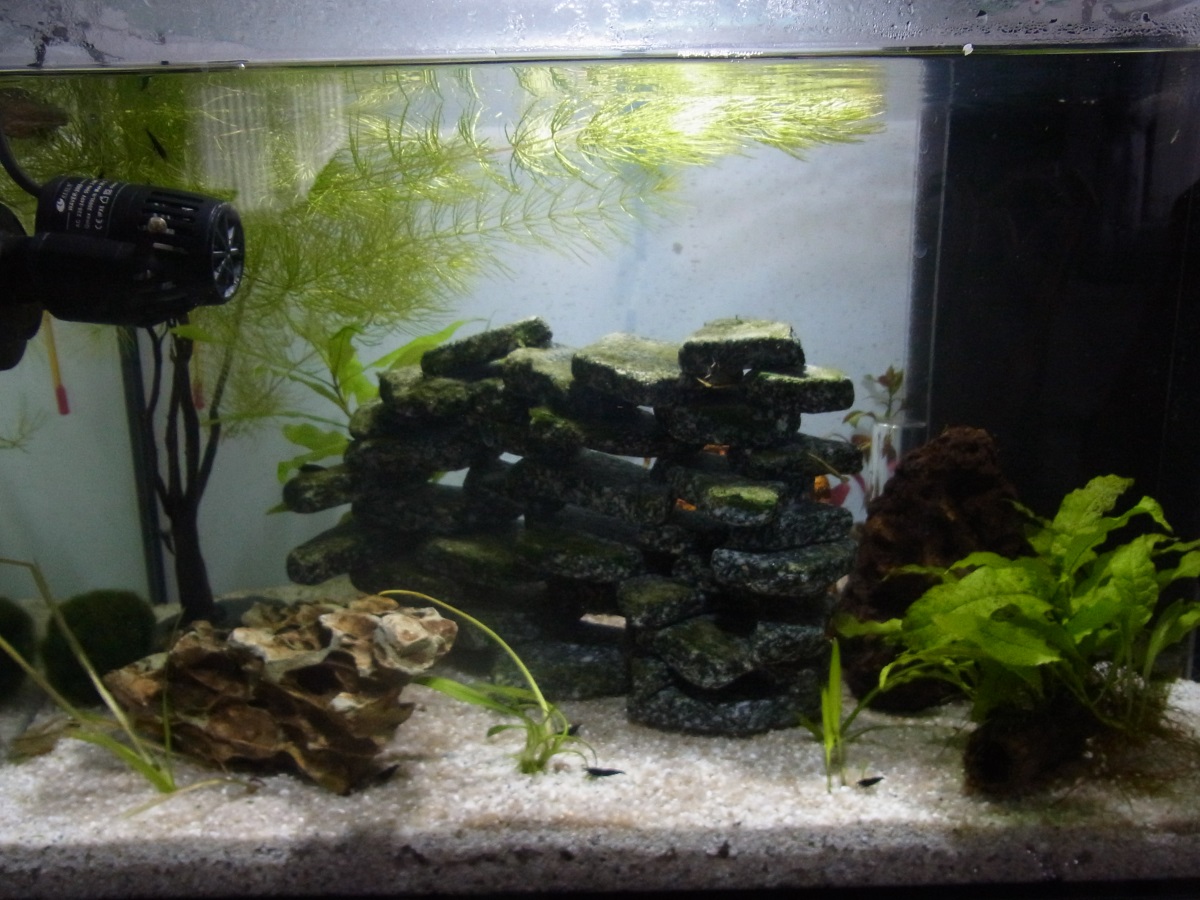 Mit im Becken sind schwarze Tigergarnelen, die finden die Strömung auch gut und Posthornschnecken. Es kommen dann noch Turmdeckelschnecken mit rein.