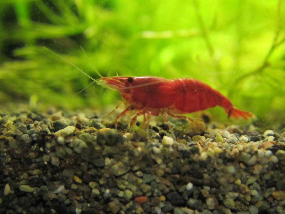 deine Wuselgarnele ist ein recht blass gefärbtes Red-Fire-Männchen. Meine Jungs hier sehen ziemlich genauso aus :). Leider wird bei Sakuras die Farbe wohl über die Männchen vererbt (bitte korrigieren, falls ich da jetzt Quatsch erzählt habe...), also würd ich ihm ein anderes Becken spendieren.