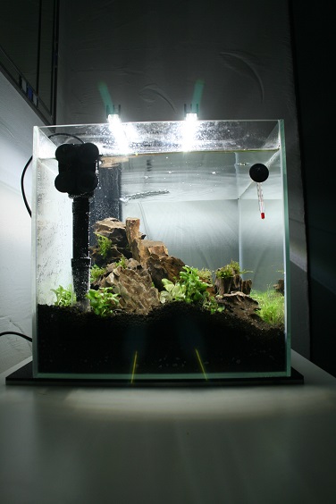 an dieser Stelle möchte nun endlich auch ich ein paar Fotos von meinem neuen Becken einstellen. Es ist ein Glasgarten 45x30x30 Weißglasbecken und soll ein neues Zuhause für PRL werden. Es läuft jetzt seit letztem Donnerstag. Seit dem letzten Wasserwechsel brummt der Aquael 500 leider ziemlich. Für Tipps, wie ich das beheben kann, wär ich euch sehr dankbar. Aktuell bin ich auch noch auf der Suche nach einer kleiner CO2-Anlage, die aber die Optik nicht kaputt machen soll. Für mich ist dieses Becken in mehrfacher Hinsicht absolutes Neuland: mein erstes Becken mit Bodenfilter und mit HMF, bisher ohne CO2, mit viel Drachensteinen und nur niedrigen Pflanzen / Bodendeckern, so dass ich gespannt bin, was noch alles auf mich zukommt.