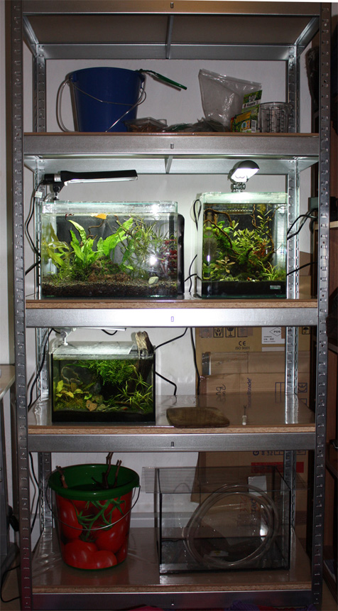 Ich hatte früher schonmal Zwerggarnelen (White Pearl, Amanos und Neocaridina heteropoda in der Nominatform), aber eher so nebenbei. Dann für eine Weile gar keine Aquarien, und nun hab ich mir ein 12 L Pfützchen ins Bücherregal gestellt, aus dem innerhalb von 10 Wochen 4 Becken in einem Schwerlastregal (mit Platz für mindestens noch zwei *hüstel*) geworden sind.