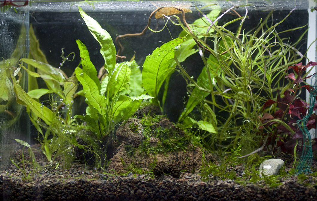 20 L Dennerle Cube, steht seit Anfang März. Der Cube war von Anfang an etwas zickig, darum hat er auch einen Filter.. jetzt so langsam gehts und ich erwäge, ihn doch filterlos laufen zu lassen. Von der Bepflanzung her gefällt er mir aber am Besten, das Kammblatt hinten rechts ist neu und passt richtig gut rein. Es wächst auch schon fleißig, genau wie die Moose. Fissidens ist halt laaaangsam.. und bei mir kriegt keiner CO2.