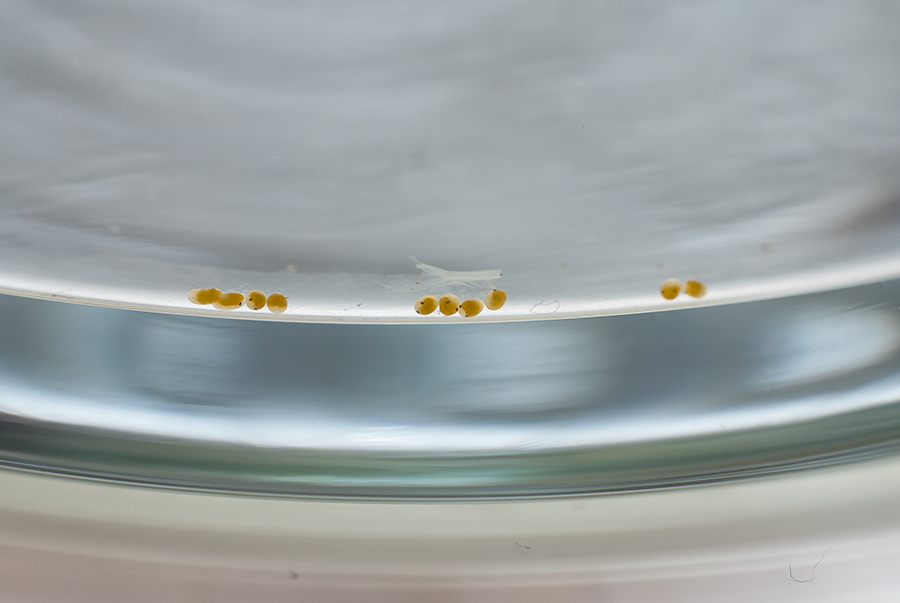 auf dem Foto sieht es so aus, als würde an den mittleren Eiern noch ein Schwimmbein/Panzerrest dran kleben. Ich würde versuchen, diese Reste von den Eiern zu entfernen, da nach meiner Erfahrung solche Eier recht schnell verpilzen. Das ist ne Schw***fummelei, aber ich versuche sowas immer mit Wattestäbchen und Pinzette unter einer Lampen-Lupe.