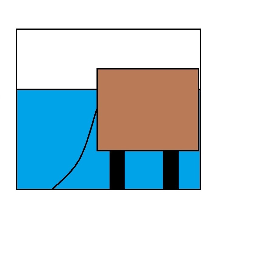 Jetzt ist es aber so das es nicht schön finde direkt auf die Stelzen zu schauen. Daher habe ich mir gedacht ich baue eine art Verkleidung davor. Zu sehen auf dem Bild rechts. Etwas geschwungen damit das ganze von vorne aussieht wie eine Uferböschung.