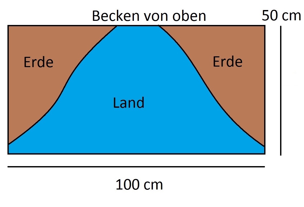 Das ganze Becken wird geflutet. Land wird aufgeteilt in zwei hälften und auf Stelzen gestellt. Hatte gedacht den Landteil 15 hoch zu bauen und die Stelzen 10 cm hoch. Das Wasser kommt bis ungefähr 2 cm unterhalt des oberen Endes des Landsteils. Das ergibt dann unterm Landteil einen Wasserstand von 10 cm und überall sonst 30-33 cm Wasser.