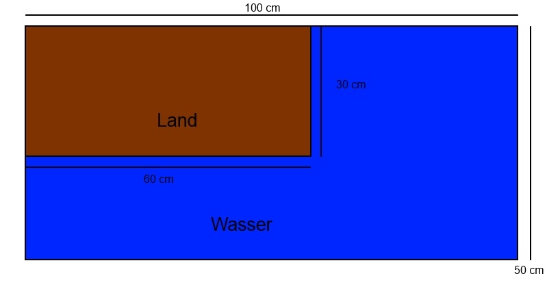 Ich werde auf dem Boden Glasscheiben einkleben und somit den Land vom Wasserteil trennen. So entsteht ein Landteil von 60x30 cm mit Erde, wo die Krabben auch mal buddeln können. Und der Rest wird Wasser. Das Wasser soll 20 cm hoch sein. Ich denke so sollte für genügend Wasseranteil gesorgt sein. Das wären dann 64 Liter. Natürlich wird es so strukturiert das genügend Klettermöglichkeiten aus dem Wasser vorhanden sind.