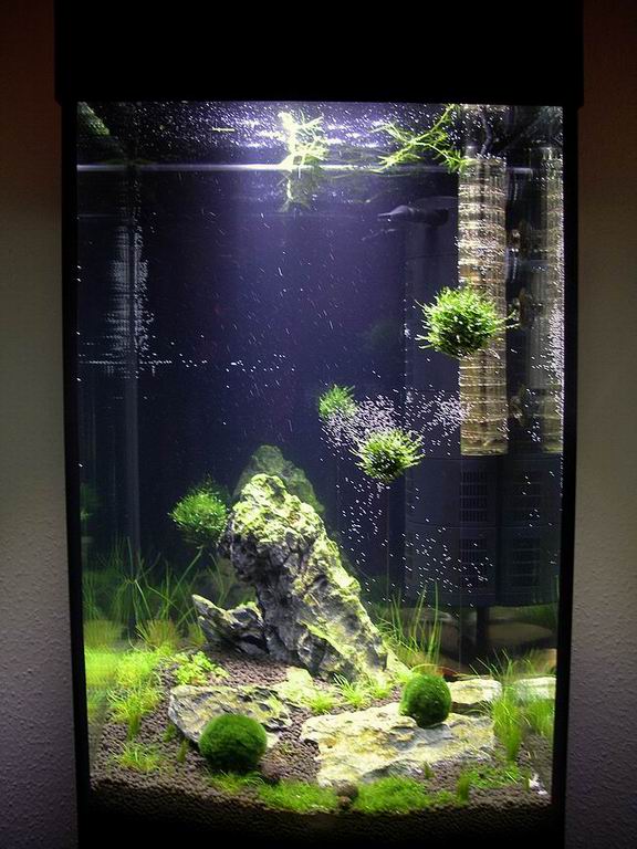 was war passiert: wie ich schon an einigen stellen hier berichtet habe, wurde das becken aus unterschiedlichen gründen mehrfach umgestaltet. geplanzt wurde das 40x40x65 große nano mit hauptsächlich bodendeckern wie eleocharis parvula, vivipara und acicularis, dazu etwas korallenmoos und ein paar moosbälle. das nano wurde von woha serienmäßig mit 2x 11 w ESl geliefert, für diese höhe ein echter lacher...ich habe daher auf anraten des hiesigen fachhandels auf LED umgerüstet. eine 24w LED suna eco von tropic marin wurde angeschafft. da LED ja direkt nach unten strahlt und mein iwagumi ja schon gestaltet war, habe ich mir darüber zunächst auch keine gedanken gemacht und die lampe einfach übers becken gelegt.