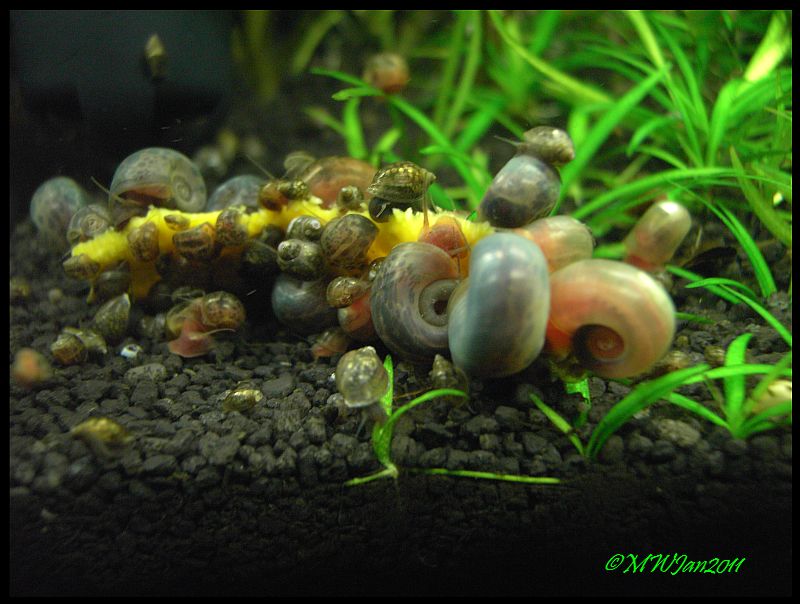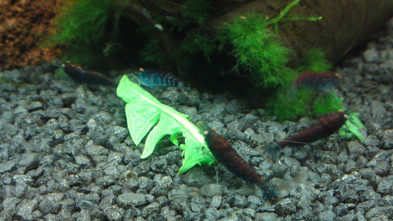 Mit durchaus gemischtem Ergebnis. Die Blue Bees und alle Neocaridina-Arten fahren voll drauf ab, die schleckigen Tiger gehen gar nicht dran (wen wundert's...), und im Sulawesi-Inlands-Becken wird er ebenfalls komplett ignoriert, auch von Knutschi dem Antennenwels. Nur die Neons zupfen dran...