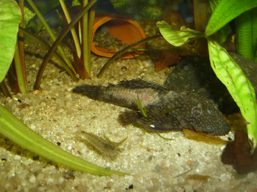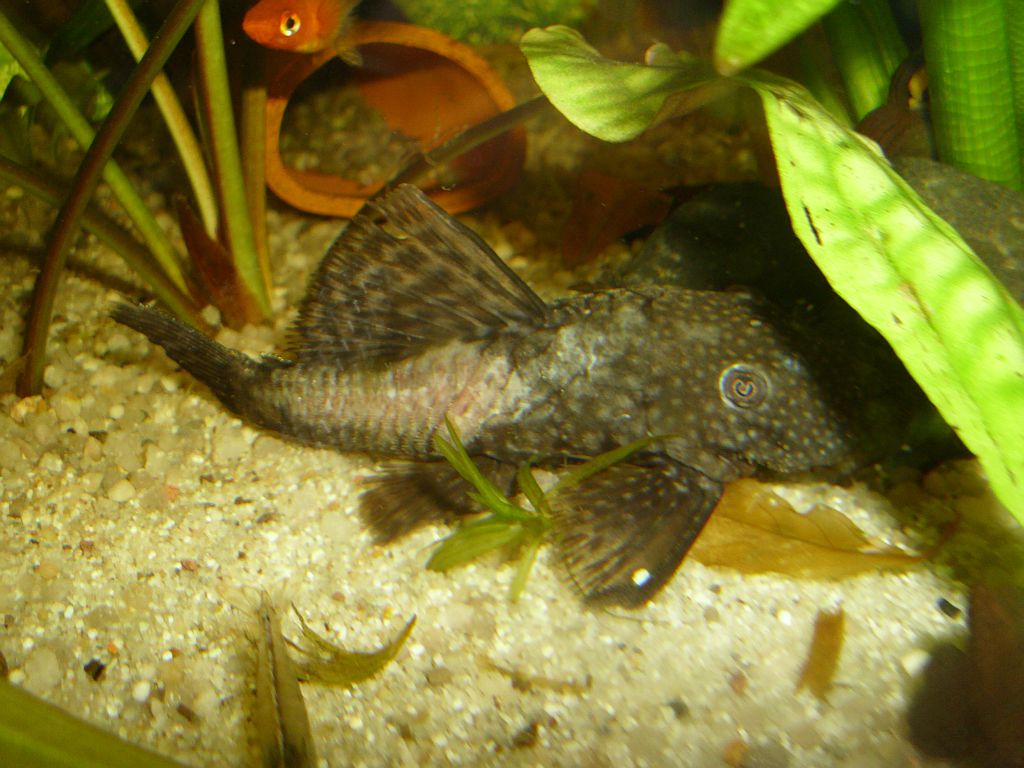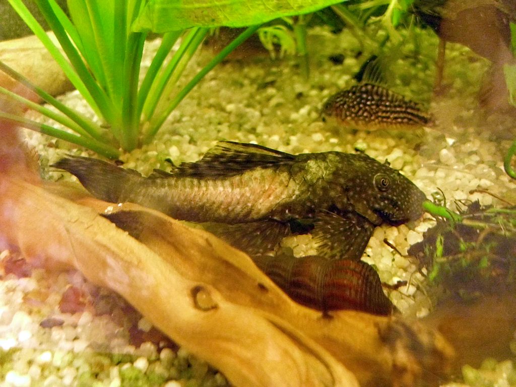 Sie lebt zusammen mit Platies, Amanogarnelen und einer Halsbandgarnele in einem Gemeinschaftsbecken. Die Temperatur beträgt 25 Grad.