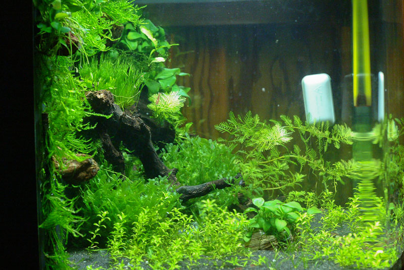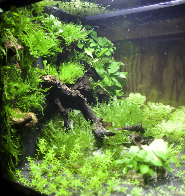 An die Rückwand wurden Lavabrocken geklebt, auf denen Anubias und Weeping Moos wächst.