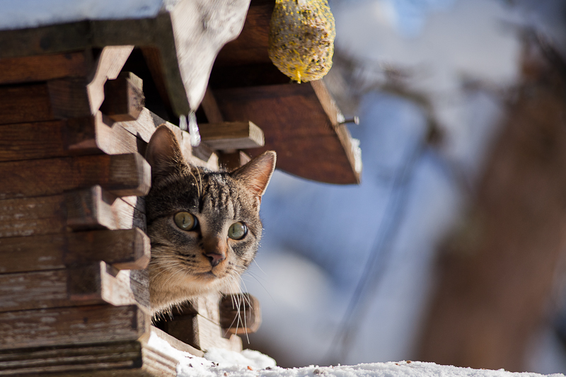Tigerchen saß den Winter über immer wieder im Vogelhaus....die Vögel waren aber immer schneller. Anscheinend wars da mollig warm auf den ganzen Körnern