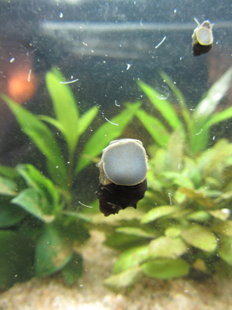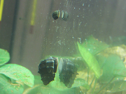 Die Anubias sind so zahlreich, da sie definitiv das Gewicht der großen Brotia tragen und die Nana sogar das Posthörnchen. Bei anderen Pflanzen mit weniger stabilem Blattwerk gab es teilweise das Problem mit Runterfallen, auf dem Rücken landen, herumflubbern wie ein dicker Käfer und Umdrehen nicht schaffen. Die Echinodorus wird entgegen aller Erwarten auch gern abgegrast- wenn sie schwerer werden, dürfte das dann eher schwierig werden, aber noch schnecken die Kleinen fröhlich drauf herum.