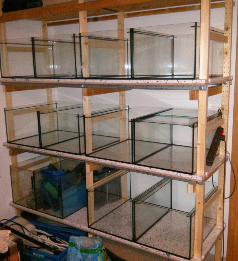 • Ablauf jedes Beckens in ein Filterbecken-System unterhalb des Regals