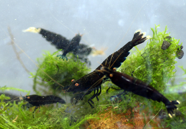 Hier haben wir zur Ansicht Tiere der Linie Midnight Prince. Das ist ein absolut stabiler und erbfester Stamm von blau/schwarzen Tigergarnelen, die teilweise ein weißes Muster/ Punkte auf dem Schwanz aufweisen.