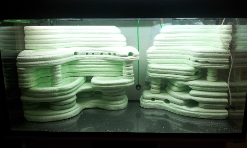 Ich habe Styrodurplatten verwendet die ich in Form gebracht und geschichtet habe. Die Platten werden mit Silikon zu insgesamt fünf Modulen zusammengefügt und anschließend mit einem dunklen Mörtel beschichtet. Sobald das geschehen ist und alles schön ausgehärtet ist werden die Module im Aquarium mit Silikon verklebt und so auch im Aquarium selbst befestigt.
