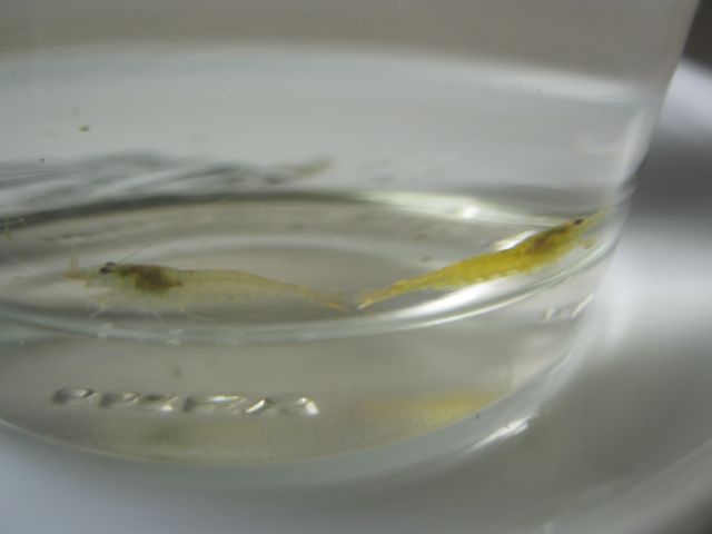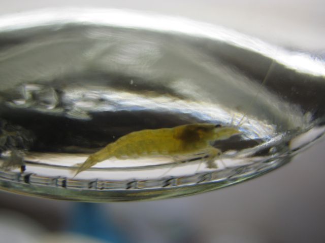 Heute noch im selben AQ, habe ich noch 5 rote Tiger rausgefischt.Habe mal versucht so gut es ging Bilder zu bekommen,die Garnelen sind ca 1cm groß.