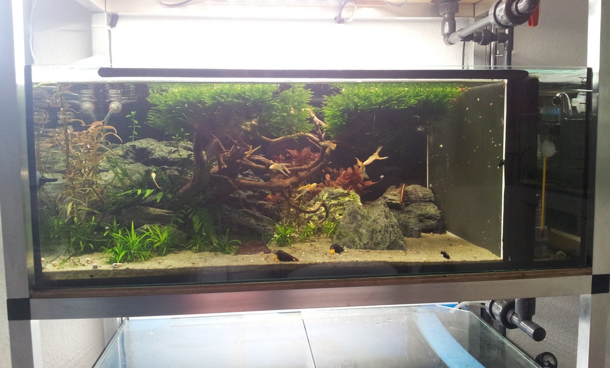 Für die Einrichtung kam als Bodengrund Nanoplättchenkies (Schiefer), Schieferplatten zu einem "Turm" zusammen geklebt und eine Moorkien Holzwurzel zum Einsatz. Als Wasser benutze ich Osmosewasser, welches zusätzlich über einen Aqualight Mischbettharzfilter gefiltert wird, mit Sulasalz 8,5 aufgehärtet (Leitwert 250; GH 6; KH 4). Nettowasserinhalt Aquarium: 85 Liter.