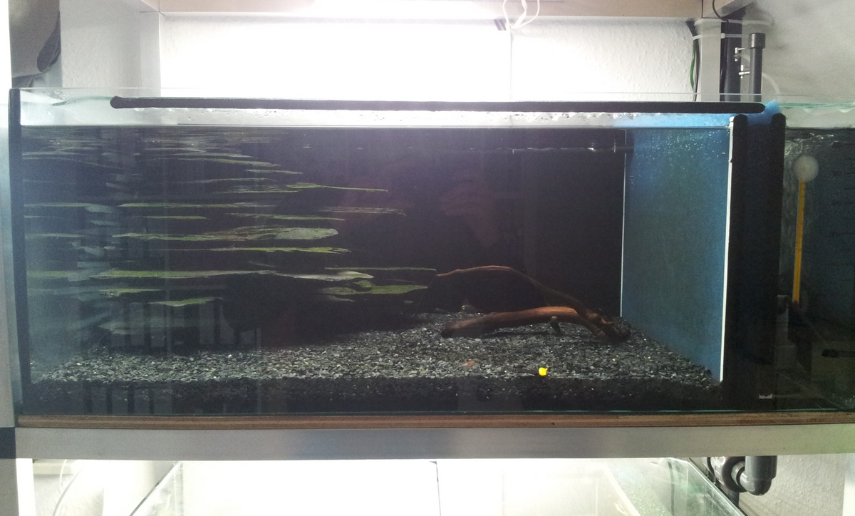 Gestern habe ich den Bodenfluter entfernt und den Bodengrund auf 0,5 cm reduziert. Den Schieferaufbau habe ich etwas nach innen gerückt, damit ich die seitliche Scheibe mit einem Algenmagneten reinigen kann... Ausserdem ist durch den Umbau auch ein 100% Wasserwechsel abgefallen.