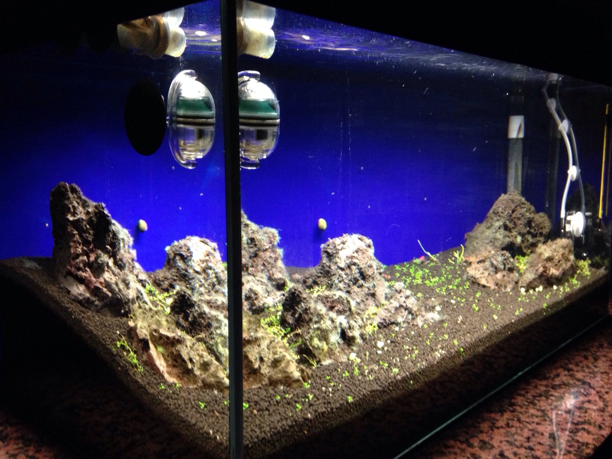 Da das schon das zweite Layout in diesem Becken ist, weiß ich schon, dass das HC zwar langsam wächst aber trotzdem nach einiger zeit einen schönen Teppich bildet obwohl nur ein 15w Lampe drüber hängt. :D