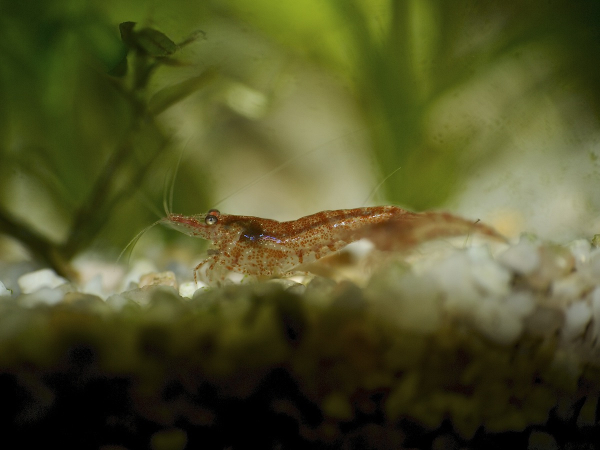 Hier mal eine Nahaufnahme einer unserer Garnelen (Jungtier). Dazu muss man noch sagen, dass die mehr oder weniger unterschiedliche Farben haben, die eine ist rötlich, die andere bläulich, wieder andere grünlich und manche auch eher klar (durchsichtig).