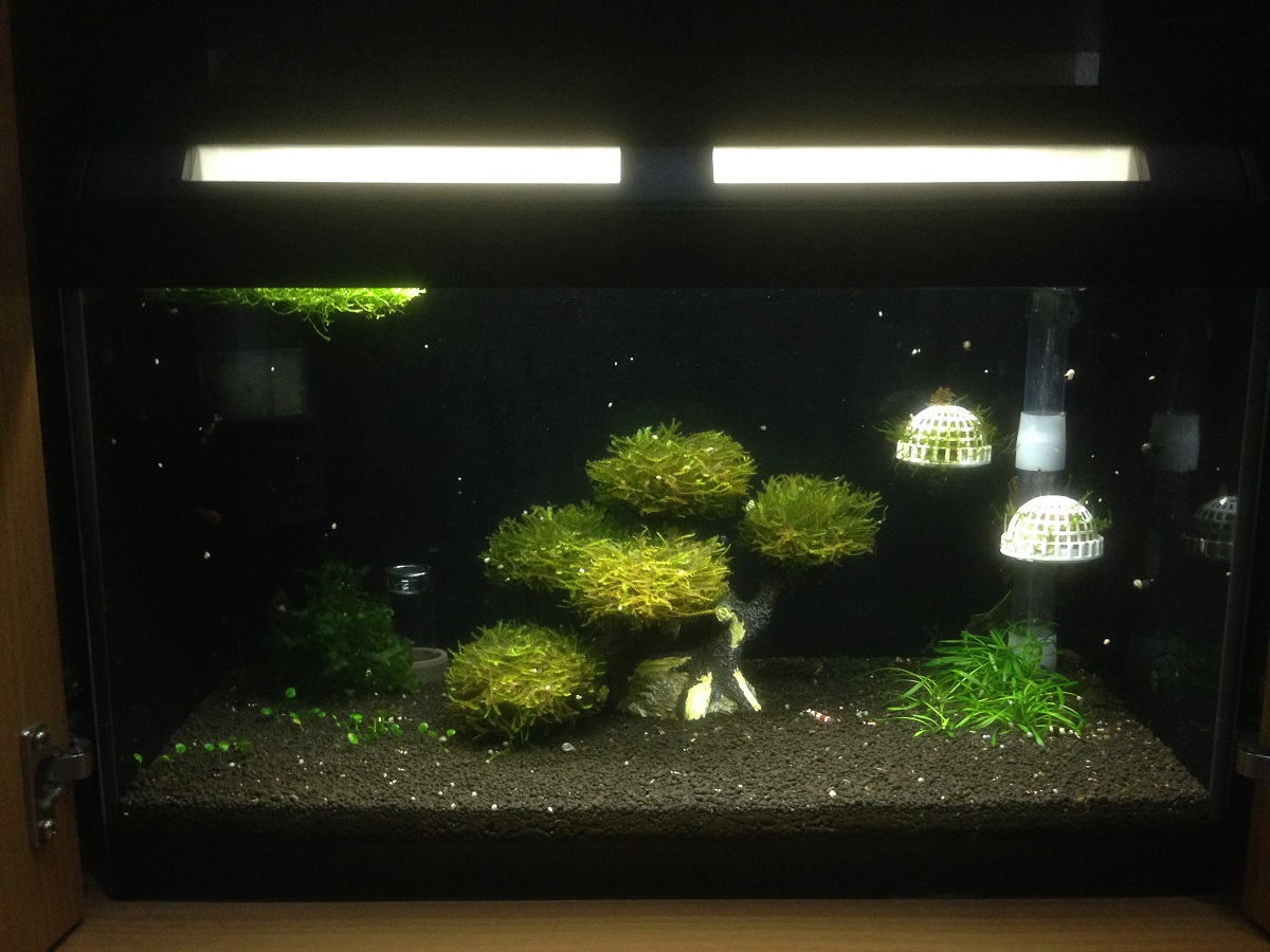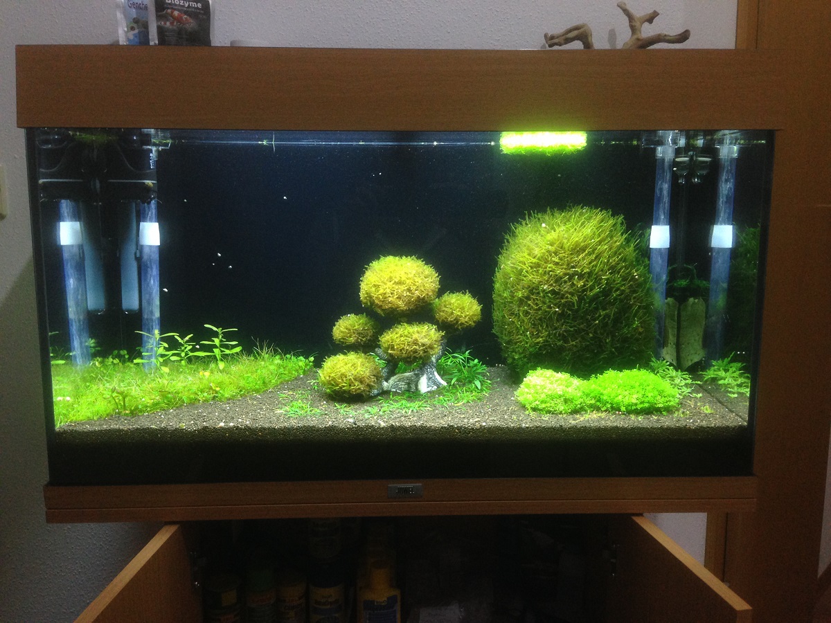 Die Deko ist eher übersichtlich gewählt, auch hier ein Bonsai Tree und schwebende Mooskugeln, die aber noch nicht so gut anwachsen wollen..