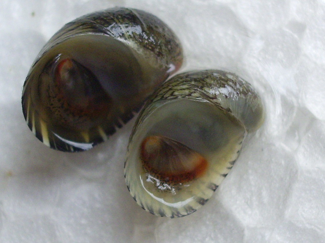 Bei der gemeinen Kahnschnecke hat das Operculum keinen Zapfen, nur einen roten Rand.