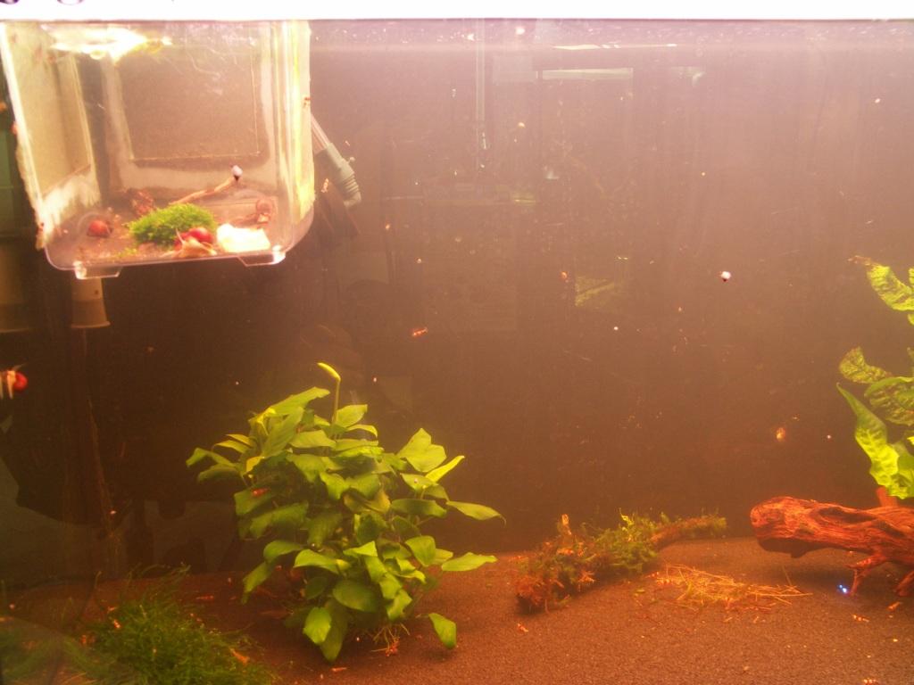 Und so sieht mein genutzter Einhängekasten im 200l Becken aus. Längsansicht, das finde ich mittlerweile besser als quer, denn so stört der Kasten weniger beim Betrachten des großen Beckens. Durch die Luftheber-Filterung hat der Kasten also die Wassermenge von 200l zur Verfügung. Das scheint den Garnelen zu gefallen, denn mein vorheriger Besatz von blauen Tiger Jungtieren hat klammheimlich Eier angesetzt und Jungtiere entlassen, die die veralgten Seitennetze total gerne abweiden und dadurch gut sichtbar sind :). Frivoles Volk *g*!