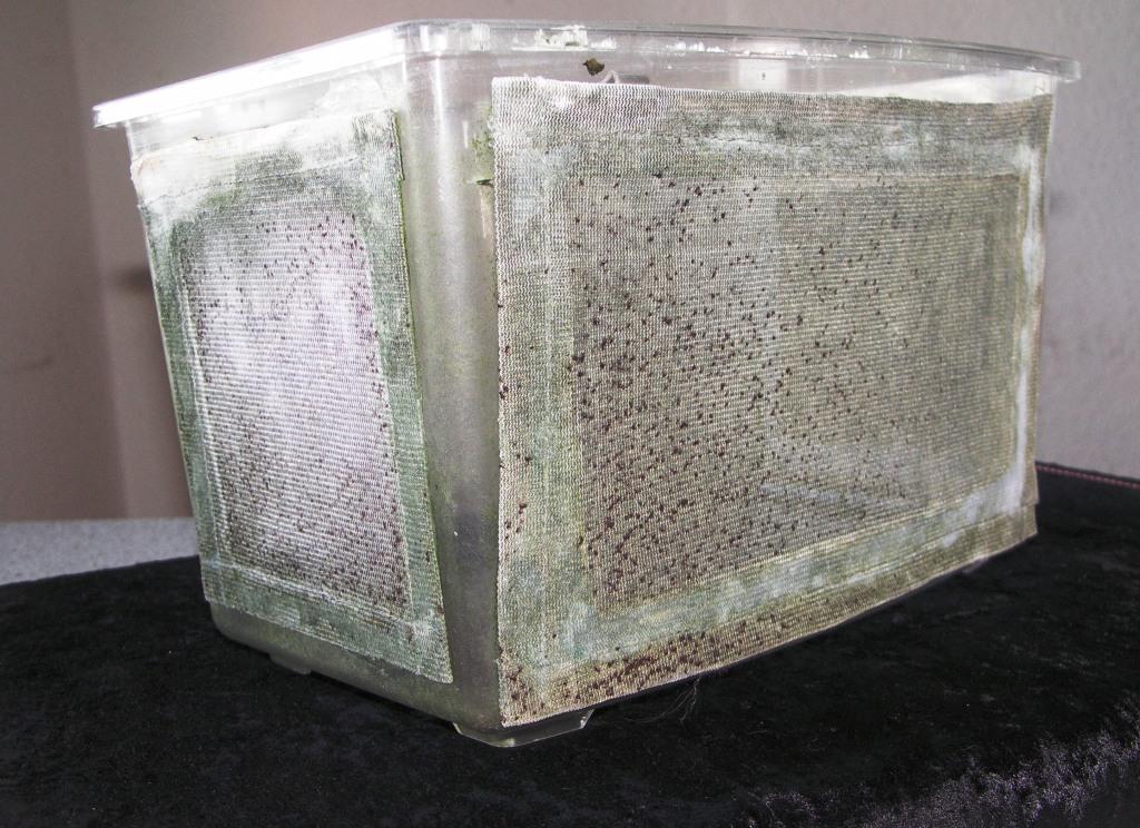 ...).Und so sieht mein genutzter Einhängekasten im 200l Becken aus. Längsansicht, das finde ich mittlerweile besser als quer, denn so stört der Kasten weniger beim Betrachten des großen Beckens. Durch die Luftheber-Filterung hat der Kasten also die Wassermenge von 200l zur Verfügung. Das scheint den Garnelen zu gefallen, denn mein vorheriger Besatz von blauen Tiger Jungtieren hat klammheimlich Eier angesetzt und Jungtiere entlassen, die die veralgten Seitennetze total gerne abweiden und dadurch gut sichtbar sind :). Frivoles Volk *g*!