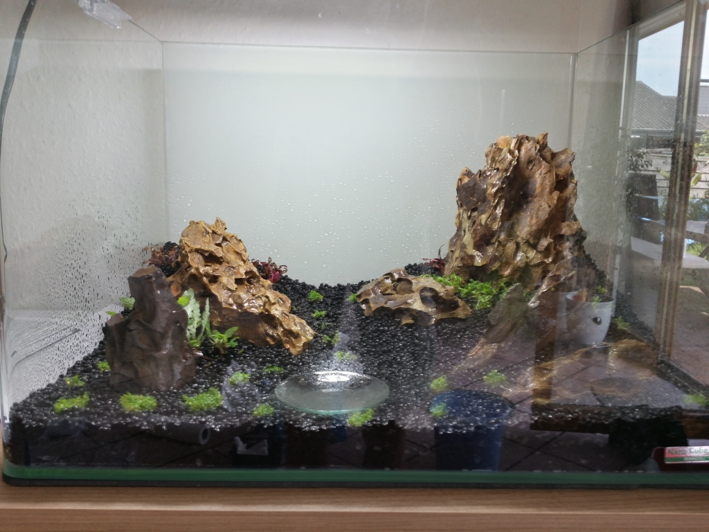 Zur Zeit habe ich einen 30l Cube mit Wundertüten Blue-Jellys und vor knapp drei Wochen habe ich einen Scaper's Tank nach der Dry-Start Methode gestartet.