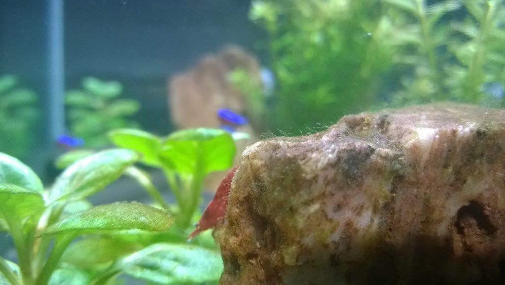 Dann habe ich mir bei Interaquaristik 10 rote Neocaridina heteropoda bestellt. Und just in diesem Moment - noch bevor die Guten einziehen konnten - verwandelte sich mein Becken in eine Fadenalgen-Oase. Überall siedelten sich grüne, bestimmt 3 bis 4 cm lange Fäden an. Die Steine waren komplett grün, der Kies wurde grün und braun und auch mein schöner Rasen war hin. Ein SiO2 Test ergab 1,2. Also ein wenig SilikatEx in einem Teebeutel in den Filter und der Wert sank auf 0,4. Viele Pflanzen mussten leider dran glauben. Die Steine, den Heizer, den Filter und die Scheiben konnte ich in mühevoller Kleinstarbeit mit einer Zahnbürste reinigen. Zeitgleich sind auch die neuen Bewohner eingetroffen. Leider haben aber nur fünf den Transport überlebt. Interaquaristik ist aber so fair und schickt mir noch diese Woche neue Tiere zu. Hoffentlich schaffen diese den Transport!