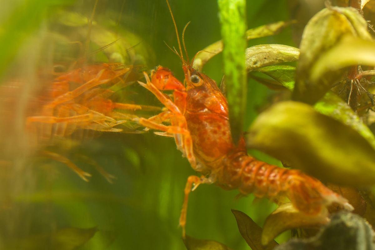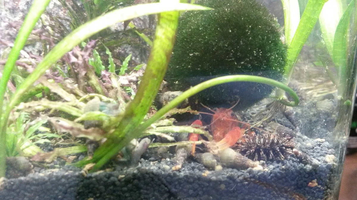 Gefüttert wurde er hauptsächlich mit JBL NanoCrabs, da er so gut wie alle anderen Futter verschmäht hat, die wir ihm angeboten haben (Hokkaido, Fischfutter, Garnelenfutter (Peters Laden, Shrimp King), Blätter hatte er immer drin, aber nie gefressen). Öfters hat er auch Frostfutter bekommen, das mochte er gern, wenn es am Haufen auf dem Boden lag, wenn nicht, hat er es nicht gefunden. Auch Lebendfutter hat er im Allgemeinen nicht gefangen bekommen. Später hat er noch Menschenfuttergarnele bekommen, mehr dazu später.