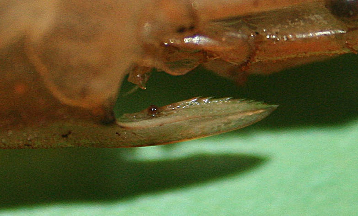 Nun gibt´s doch schon ein Ergebnis. Ich habe die Exuvie meines Spinipes-Weibchens gefunden. Ein Blick durch die 12 fach Lupe zeigte 6 saubere, spitze Zähnchen. Das Foto das ich mit der Fimen-Kamera gemacht habe, zeiget das leider nicht ganz so deutlich, aber ich denke es geht einigermaßen.