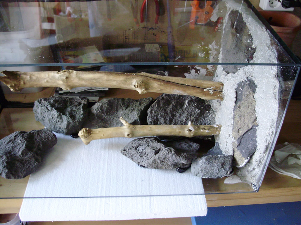 Im Keller stand noch ein gebrauchtes 60cm langes Aquarium, dass aber leider an den Silikonnähten leckte.
