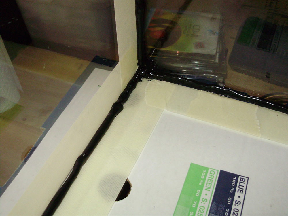 Jürgen stellte das Aquarium hochkant und klebte etwas von dem zuvor erwähnten Utensilien zu