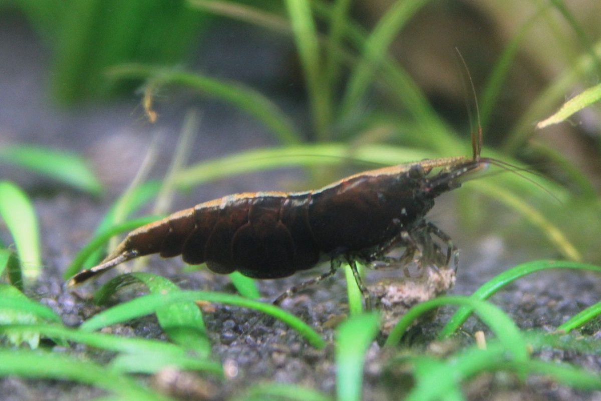 ...ich habe vor einiger Zeit als blinden Passagier eine (laut Quelle) "variable Rückenstrichgarnelen" bekommen, die sich wirklichen prächtig entwickelt hat und eine schöne dunkelbraune (je nach Lichteinfall rötlich-braun schimmernde) Färbung mit einem deutlichen, hellen Rückenstrich hat.