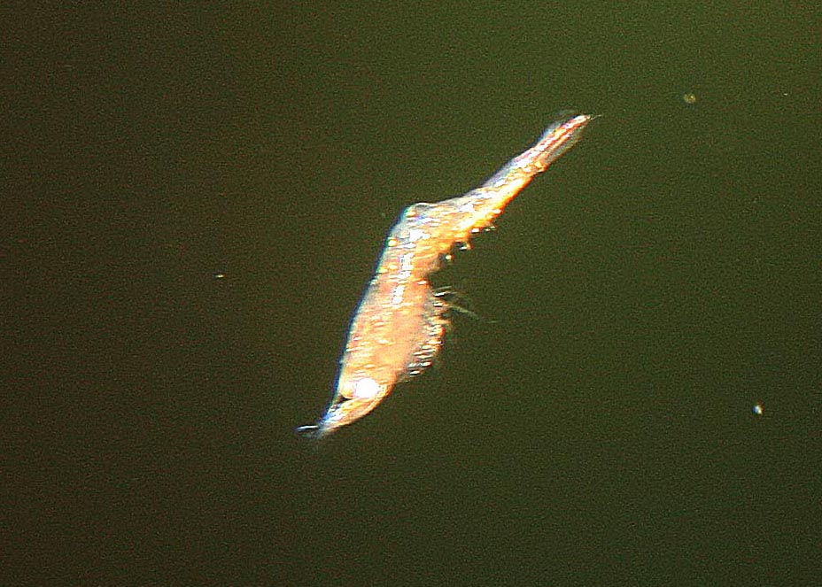 Eine Spinipes hat nun auch die Vertikale verlassen und saust nun durchs Becken. Die sieht von der Form jetzt eher wie `ne Gammarus aus. Leider bleibt sie nirgends sitzen schon gar nicht in der Nähe meiner Lupe. Ihr Schwimmstil ist zügig aber etwas pulsierend, der Motor stottert wohl 8o