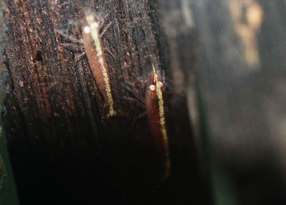 Für mich auffällig war, dass alle Tiere die im Transferbehälter grau bis transparent umfärbten, auch überlebten und einige die rötliche Rest-Pigmentierungen behielten, am selben oder spätestens am nächsten Tage tot waren. Im Süßwasser färbten die Überlebenden sich aber in ein bis zwei Tagen, sofern sie auf dunklem Grund saßen, komplett in ihre spätere Farbe (siehe die Bilder auf dem Steinholz) mit dem weißen Rückenstrich um.
