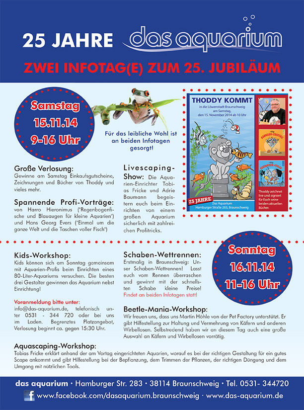Das Aquarium von Harald Soßna in Braunschweig wird 25 Jahre. Wir gratulieren herzlichst und würden uns sehr freuen, wenn Ihr auch zu der Jubiläumsveranstaltung am 15.11.2014 von 9-16 Uhr und am 16.11.2014 von 11-16 Uhr bei "das Aquarium" in Braunschweig vorbei schaut.