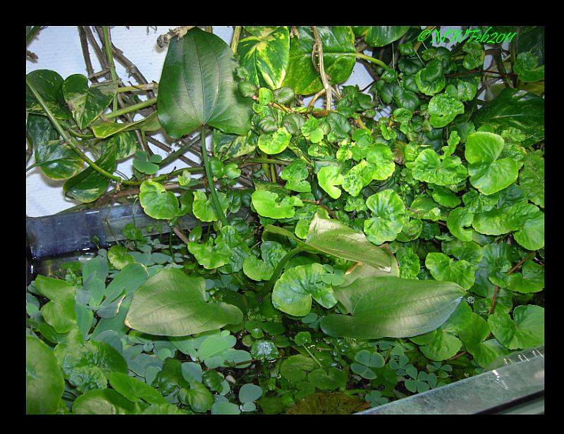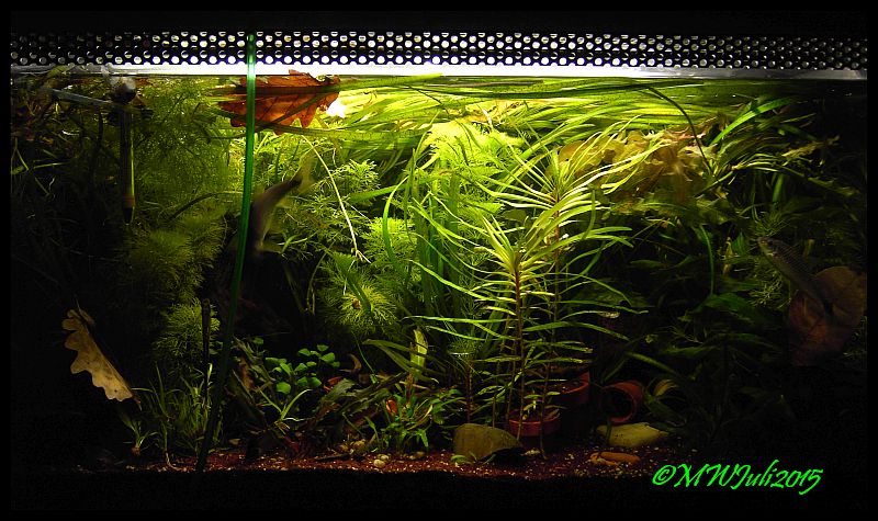 Der Wasserstand is bis 5cm untern Rand und gerade in den Randbereichen sind entweder Pflanzen die rauswachsen oder schwimmpflanzen. Mit Knickstrohhalmen, die zum Futterring gebogen sind, werden die dort gehalten wo sie sein sollen.