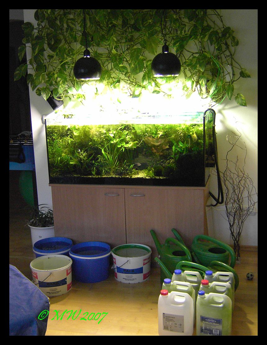 Leider kann ich in dem Eimer nur 10 Liter Wasser abstehen lassen (bleibt die Frage ob sich dadraus Schadstoffe lösen), den anderen brauche ich für den Wasserwechsel.