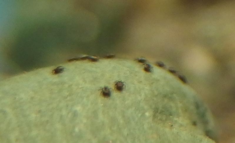 Heute habe ich 'Punkte' entdeckt, und unter der Lupe sind es Milben, geform wie ein Sesamkorn, halb so gross wie ein Sesamkorn und dunkelbraun. Sie bewegen sich gaaanz langsam. Ich habe versucht sie zu fotografieren - Stein an die Scheibe geschoben und klick. Bitte stört euch nicht an der schlechten Bildqualität!