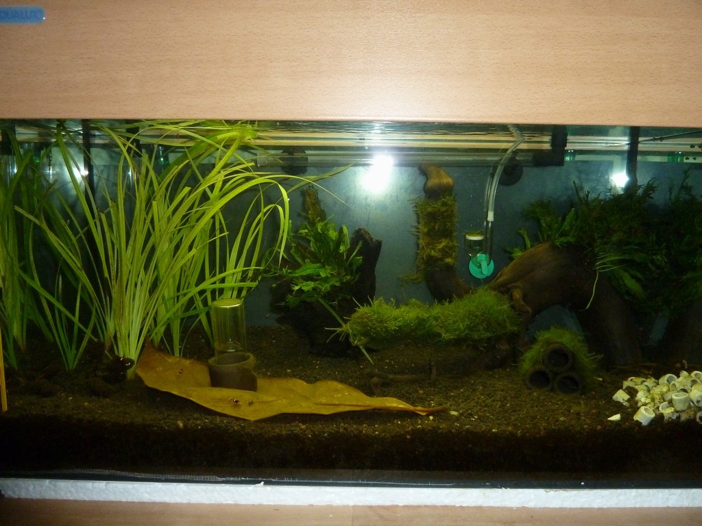 So, da ich mein Bodenfilter jetzt mit einem Eden511 betreibe, da der 501 auf Grund der Steigung nicht genug Leistung hatte, habe ich gleich einmal das Layout etwas verändert. In dem Becken tummeln sich trotz 2-3 Ausfällen ca 25 Taiwaner von Baby bis adult, es kommt also langsam aber sicher in Schwung. Desweiter wohnt jetzt ein Snow White mit in dem Becken, mal schaun was da so rauskommt. Jetzt suche ich nur noch einen Ansaugtrichter für den Aquael Bodenfilter, da ich gern auf beiden Seiten ein Ansaugrohr installieren möchte um den Boden gleichmäßiger zu durchströmen.