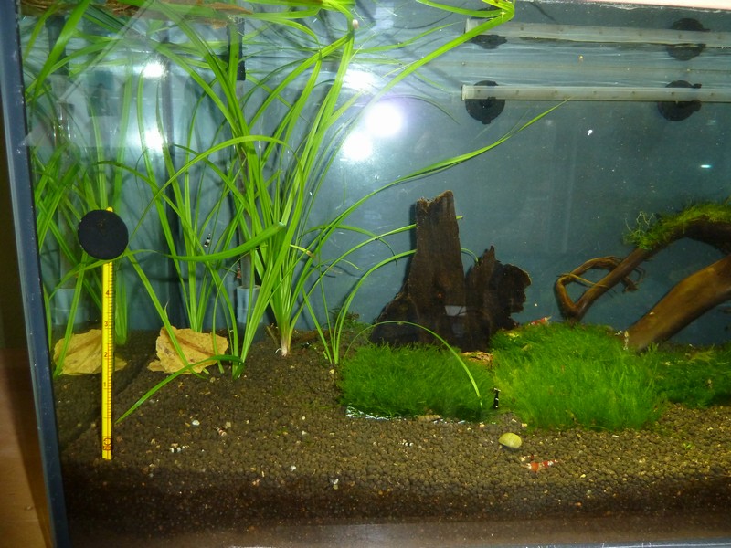 4x Triangelmoos (Cratonneuron filicinum), 1x Javamoos (aufgebunden,Taxiphyllum barbieri), 1x Nadelsimse (Eleocharis acicularis) und Cyperus helferi, welches ich bei Fank im Landen im großen Becken sah. also muss es auch mit weichem, niedrig pH-Wert-Wasser klarkommen und ich habe es schon in anderen Becken da es mir super gefällt.